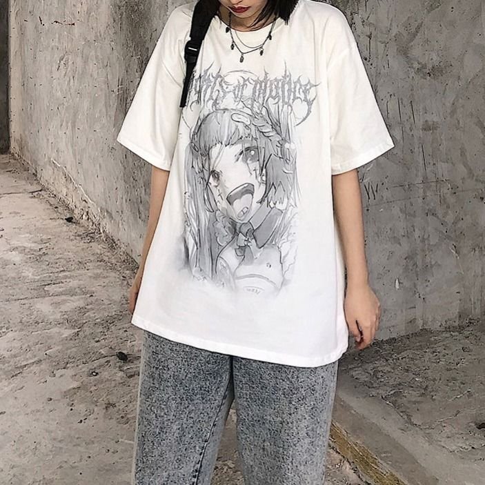 西米克 白色短袖水墨卡通叛逆少女涂鸦动漫画男女宽松情侣T恤上衣热门设计联盟服务商