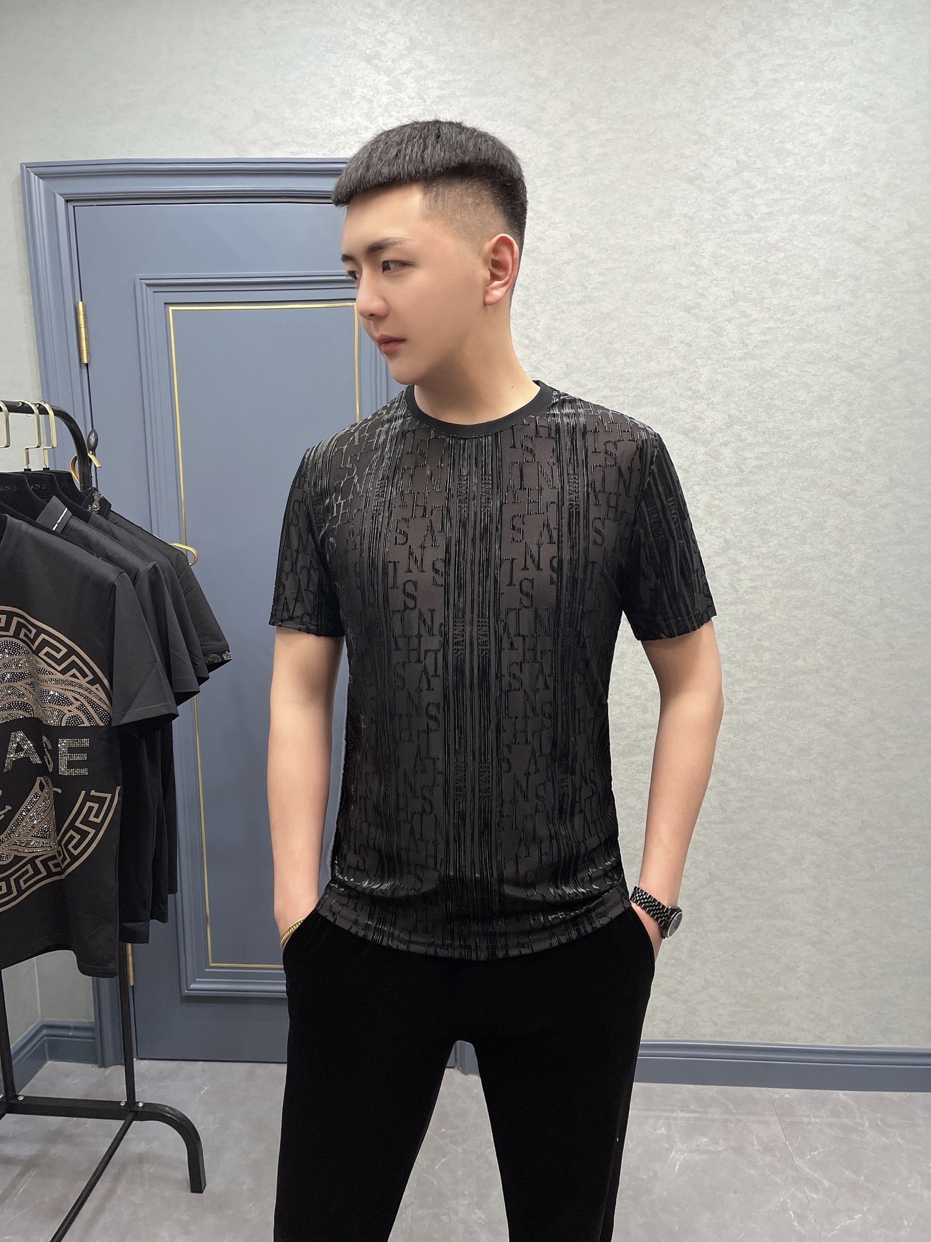 欧洲站2021夏季男士商务金丝棉圆领透气短袖t恤修身蕾丝半袖潮牌热门设计联盟服务商